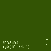 Цвет #335404 в цветовой модели RGB обозначается тремя октетами (51, 84, 4) в десятичном формате и #335404 в шестнадцатиричном (hex) формате, которые являются интенсивностью красного 51 (hex 33), интенсивность зелёного 84 (hex 54) и интенсивность синего 4 (hex 04).