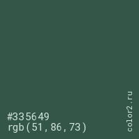 Цвет #335649 в цветовой модели RGB обозначается тремя октетами (51, 86, 73) в десятичном формате и #335649 в шестнадцатиричном (hex) формате, которые являются интенсивностью красного 51 (hex 33), интенсивность зелёного 86 (hex 56) и интенсивность синего 73 (hex 49).