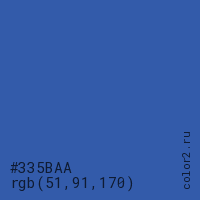 Цвет #335BAA в цветовой модели RGB обозначается тремя октетами (51, 91, 170) в десятичном формате и #335BAA в шестнадцатиричном (hex) формате, которые являются интенсивностью красного 51 (hex 33), интенсивность зелёного 91 (hex 5B) и интенсивность синего 170 (hex AA).