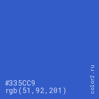 Цвет #335CC9 в цветовой модели RGB обозначается тремя октетами (51, 92, 201) в десятичном формате и #335CC9 в шестнадцатиричном (hex) формате, которые являются интенсивностью красного 51 (hex 33), интенсивность зелёного 92 (hex 5C) и интенсивность синего 201 (hex C9).