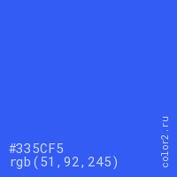 Цвет #335CF5 в цветовой модели RGB обозначается тремя октетами (51, 92, 245) в десятичном формате и #335CF5 в шестнадцатиричном (hex) формате, которые являются интенсивностью красного 51 (hex 33), интенсивность зелёного 92 (hex 5C) и интенсивность синего 245 (hex F5).