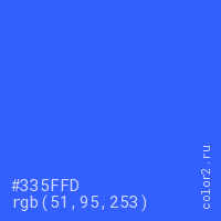 Цвет #335FFD в цветовой модели RGB обозначается тремя октетами (51, 95, 253) в десятичном формате и #335FFD в шестнадцатиричном (hex) формате, которые являются интенсивностью красного 51 (hex 33), интенсивность зелёного 95 (hex 5F) и интенсивность синего 253 (hex FD).