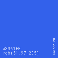 Цвет #3361EB в цветовой модели RGB обозначается тремя октетами (51, 97, 235) в десятичном формате и #3361EB в шестнадцатиричном (hex) формате, которые являются интенсивностью красного 51 (hex 33), интенсивность зелёного 97 (hex 61) и интенсивность синего 235 (hex EB).
