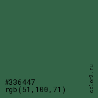 Цвет #336447 в цветовой модели RGB обозначается тремя октетами (51, 100, 71) в десятичном формате и #336447 в шестнадцатиричном (hex) формате, которые являются интенсивностью красного 51 (hex 33), интенсивность зелёного 100 (hex 64) и интенсивность синего 71 (hex 47).