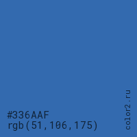 Цвет #336AAF в цветовой модели RGB обозначается тремя октетами (51, 106, 175) в десятичном формате и #336AAF в шестнадцатиричном (hex) формате, которые являются интенсивностью красного 51 (hex 33), интенсивность зелёного 106 (hex 6A) и интенсивность синего 175 (hex AF).