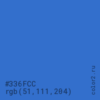 Цвет #336FCC в цветовой модели RGB обозначается тремя октетами (51, 111, 204) в десятичном формате и #336FCC в шестнадцатиричном (hex) формате, которые являются интенсивностью красного 51 (hex 33), интенсивность зелёного 111 (hex 6F) и интенсивность синего 204 (hex CC).