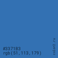 Цвет #3371B3 в цветовой модели RGB обозначается тремя октетами (51, 113, 179) в десятичном формате и #3371B3 в шестнадцатиричном (hex) формате, которые являются интенсивностью красного 51 (hex 33), интенсивность зелёного 113 (hex 71) и интенсивность синего 179 (hex B3).