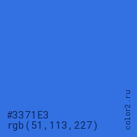 Цвет #3371E3 в цветовой модели RGB обозначается тремя октетами (51, 113, 227) в десятичном формате и #3371E3 в шестнадцатиричном (hex) формате, которые являются интенсивностью красного 51 (hex 33), интенсивность зелёного 113 (hex 71) и интенсивность синего 227 (hex E3).