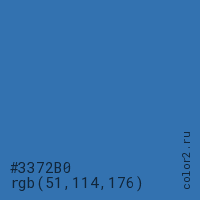 Цвет #3372B0 в цветовой модели RGB обозначается тремя октетами (51, 114, 176) в десятичном формате и #3372B0 в шестнадцатиричном (hex) формате, которые являются интенсивностью красного 51 (hex 33), интенсивность зелёного 114 (hex 72) и интенсивность синего 176 (hex B0).
