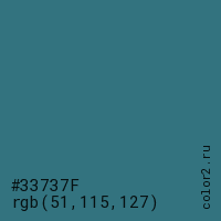 Цвет #33737F в цветовой модели RGB обозначается тремя октетами (51, 115, 127) в десятичном формате и #33737F в шестнадцатиричном (hex) формате, которые являются интенсивностью красного 51 (hex 33), интенсивность зелёного 115 (hex 73) и интенсивность синего 127 (hex 7F).