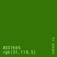 Цвет #337605 в цветовой модели RGB обозначается тремя октетами (51, 118, 5) в десятичном формате и #337605 в шестнадцатиричном (hex) формате, которые являются интенсивностью красного 51 (hex 33), интенсивность зелёного 118 (hex 76) и интенсивность синего 5 (hex 05).