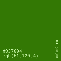 Цвет #337804 в цветовой модели RGB обозначается тремя октетами (51, 120, 4) в десятичном формате и #337804 в шестнадцатиричном (hex) формате, которые являются интенсивностью красного 51 (hex 33), интенсивность зелёного 120 (hex 78) и интенсивность синего 4 (hex 04).
