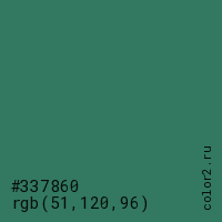 Цвет #337860 в цветовой модели RGB обозначается тремя октетами (51, 120, 96) в десятичном формате и #337860 в шестнадцатиричном (hex) формате, которые являются интенсивностью красного 51 (hex 33), интенсивность зелёного 120 (hex 78) и интенсивность синего 96 (hex 60).