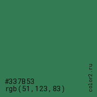 Цвет #337B53 в цветовой модели RGB обозначается тремя октетами (51, 123, 83) в десятичном формате и #337B53 в шестнадцатиричном (hex) формате, которые являются интенсивностью красного 51 (hex 33), интенсивность зелёного 123 (hex 7B) и интенсивность синего 83 (hex 53).
