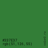 Цвет #337E37 в цветовой модели RGB обозначается тремя октетами (51, 126, 55) в десятичном формате и #337E37 в шестнадцатиричном (hex) формате, которые являются интенсивностью красного 51 (hex 33), интенсивность зелёного 126 (hex 7E) и интенсивность синего 55 (hex 37).