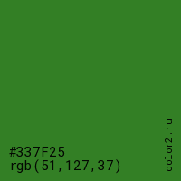Цвет #337F25 в цветовой модели RGB обозначается тремя октетами (51, 127, 37) в десятичном формате и #337F25 в шестнадцатиричном (hex) формате, которые являются интенсивностью красного 51 (hex 33), интенсивность зелёного 127 (hex 7F) и интенсивность синего 37 (hex 25).