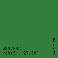 Цвет #337F3C в цветовой модели RGB обозначается тремя октетами (51, 127, 60) в десятичном формате и #337F3C в шестнадцатиричном (hex) формате, которые являются интенсивностью красного 51 (hex 33), интенсивность зелёного 127 (hex 7F) и интенсивность синего 60 (hex 3C).