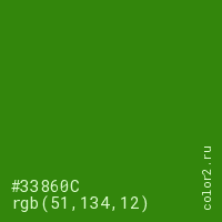 Цвет #33860C в цветовой модели RGB обозначается тремя октетами (51, 134, 12) в десятичном формате и #33860C в шестнадцатиричном (hex) формате, которые являются интенсивностью красного 51 (hex 33), интенсивность зелёного 134 (hex 86) и интенсивность синего 12 (hex 0C).
