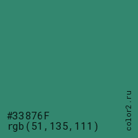 Цвет #33876F в цветовой модели RGB обозначается тремя октетами (51, 135, 111) в десятичном формате и #33876F в шестнадцатиричном (hex) формате, которые являются интенсивностью красного 51 (hex 33), интенсивность зелёного 135 (hex 87) и интенсивность синего 111 (hex 6F).