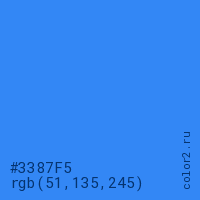 Цвет #3387F5 в цветовой модели RGB обозначается тремя октетами (51, 135, 245) в десятичном формате и #3387F5 в шестнадцатиричном (hex) формате, которые являются интенсивностью красного 51 (hex 33), интенсивность зелёного 135 (hex 87) и интенсивность синего 245 (hex F5).