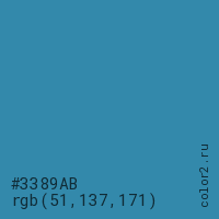 Цвет #3389AB в цветовой модели RGB обозначается тремя октетами (51, 137, 171) в десятичном формате и #3389AB в шестнадцатиричном (hex) формате, которые являются интенсивностью красного 51 (hex 33), интенсивность зелёного 137 (hex 89) и интенсивность синего 171 (hex AB).
