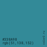 Цвет #338A98 в цветовой модели RGB обозначается тремя октетами (51, 138, 152) в десятичном формате и #338A98 в шестнадцатиричном (hex) формате, которые являются интенсивностью красного 51 (hex 33), интенсивность зелёного 138 (hex 8A) и интенсивность синего 152 (hex 98).