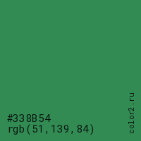 Цвет #338B54 в цветовой модели RGB обозначается тремя октетами (51, 139, 84) в десятичном формате и #338B54 в шестнадцатиричном (hex) формате, которые являются интенсивностью красного 51 (hex 33), интенсивность зелёного 139 (hex 8B) и интенсивность синего 84 (hex 54).