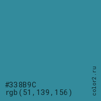 Цвет #338B9C в цветовой модели RGB обозначается тремя октетами (51, 139, 156) в десятичном формате и #338B9C в шестнадцатиричном (hex) формате, которые являются интенсивностью красного 51 (hex 33), интенсивность зелёного 139 (hex 8B) и интенсивность синего 156 (hex 9C).