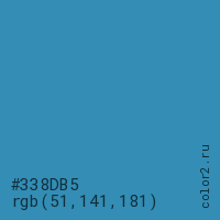 Цвет #338DB5 в цветовой модели RGB обозначается тремя октетами (51, 141, 181) в десятичном формате и #338DB5 в шестнадцатиричном (hex) формате, которые являются интенсивностью красного 51 (hex 33), интенсивность зелёного 141 (hex 8D) и интенсивность синего 181 (hex B5).