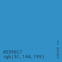 Цвет #3390C7 в цветовой модели RGB обозначается тремя октетами (51, 144, 199) в десятичном формате и #3390C7 в шестнадцатиричном (hex) формате, которые являются интенсивностью красного 51 (hex 33), интенсивность зелёного 144 (hex 90) и интенсивность синего 199 (hex C7).