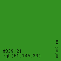 Цвет #339121 в цветовой модели RGB обозначается тремя октетами (51, 145, 33) в десятичном формате и #339121 в шестнадцатиричном (hex) формате, которые являются интенсивностью красного 51 (hex 33), интенсивность зелёного 145 (hex 91) и интенсивность синего 33 (hex 21).