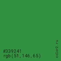 Цвет #339241 в цветовой модели RGB обозначается тремя октетами (51, 146, 65) в десятичном формате и #339241 в шестнадцатиричном (hex) формате, которые являются интенсивностью красного 51 (hex 33), интенсивность зелёного 146 (hex 92) и интенсивность синего 65 (hex 41).