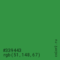Цвет #339443 в цветовой модели RGB обозначается тремя октетами (51, 148, 67) в десятичном формате и #339443 в шестнадцатиричном (hex) формате, которые являются интенсивностью красного 51 (hex 33), интенсивность зелёного 148 (hex 94) и интенсивность синего 67 (hex 43).
