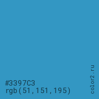 Цвет #3397C3 в цветовой модели RGB обозначается тремя октетами (51, 151, 195) в десятичном формате и #3397C3 в шестнадцатиричном (hex) формате, которые являются интенсивностью красного 51 (hex 33), интенсивность зелёного 151 (hex 97) и интенсивность синего 195 (hex C3).
