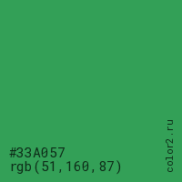 Цвет #33A057 в цветовой модели RGB обозначается тремя октетами (51, 160, 87) в десятичном формате и #33A057 в шестнадцатиричном (hex) формате, которые являются интенсивностью красного 51 (hex 33), интенсивность зелёного 160 (hex A0) и интенсивность синего 87 (hex 57).
