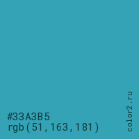 Цвет #33A3B5 в цветовой модели RGB обозначается тремя октетами (51, 163, 181) в десятичном формате и #33A3B5 в шестнадцатиричном (hex) формате, которые являются интенсивностью красного 51 (hex 33), интенсивность зелёного 163 (hex A3) и интенсивность синего 181 (hex B5).