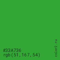Цвет #33A736 в цветовой модели RGB обозначается тремя октетами (51, 167, 54) в десятичном формате и #33A736 в шестнадцатиричном (hex) формате, которые являются интенсивностью красного 51 (hex 33), интенсивность зелёного 167 (hex A7) и интенсивность синего 54 (hex 36).