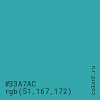Цвет #33A7AC в цветовой модели RGB обозначается тремя октетами (51, 167, 172) в десятичном формате и #33A7AC в шестнадцатиричном (hex) формате, которые являются интенсивностью красного 51 (hex 33), интенсивность зелёного 167 (hex A7) и интенсивность синего 172 (hex AC).