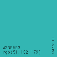 Цвет #33B6B3 в цветовой модели RGB обозначается тремя октетами (51, 182, 179) в десятичном формате и #33B6B3 в шестнадцатиричном (hex) формате, которые являются интенсивностью красного 51 (hex 33), интенсивность зелёного 182 (hex B6) и интенсивность синего 179 (hex B3).