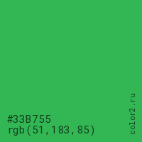 Цвет #33B755 в цветовой модели RGB обозначается тремя октетами (51, 183, 85) в десятичном формате и #33B755 в шестнадцатиричном (hex) формате, которые являются интенсивностью красного 51 (hex 33), интенсивность зелёного 183 (hex B7) и интенсивность синего 85 (hex 55).