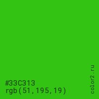Цвет #33C313 в цветовой модели RGB обозначается тремя октетами (51, 195, 19) в десятичном формате и #33C313 в шестнадцатиричном (hex) формате, которые являются интенсивностью красного 51 (hex 33), интенсивность зелёного 195 (hex C3) и интенсивность синего 19 (hex 13).