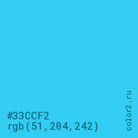 Цвет #33CCF2 в цветовой модели RGB обозначается тремя октетами (51, 204, 242) в десятичном формате и #33CCF2 в шестнадцатиричном (hex) формате, которые являются интенсивностью красного 51 (hex 33), интенсивность зелёного 204 (hex CC) и интенсивность синего 242 (hex F2).