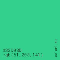 Цвет #33D08D в цветовой модели RGB обозначается тремя октетами (51, 208, 141) в десятичном формате и #33D08D в шестнадцатиричном (hex) формате, которые являются интенсивностью красного 51 (hex 33), интенсивность зелёного 208 (hex D0) и интенсивность синего 141 (hex 8D).