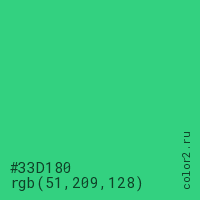 Цвет #33D180 в цветовой модели RGB обозначается тремя октетами (51, 209, 128) в десятичном формате и #33D180 в шестнадцатиричном (hex) формате, которые являются интенсивностью красного 51 (hex 33), интенсивность зелёного 209 (hex D1) и интенсивность синего 128 (hex 80).