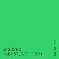 Цвет #33D36C в цветовой модели RGB обозначается тремя октетами (51, 211, 108) в десятичном формате и #33D36C в шестнадцатиричном (hex) формате, которые являются интенсивностью красного 51 (hex 33), интенсивность зелёного 211 (hex D3) и интенсивность синего 108 (hex 6C).