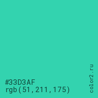 Цвет #33D3AF в цветовой модели RGB обозначается тремя октетами (51, 211, 175) в десятичном формате и #33D3AF в шестнадцатиричном (hex) формате, которые являются интенсивностью красного 51 (hex 33), интенсивность зелёного 211 (hex D3) и интенсивность синего 175 (hex AF).