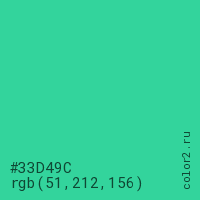 Цвет #33D49C в цветовой модели RGB обозначается тремя октетами (51, 212, 156) в десятичном формате и #33D49C в шестнадцатиричном (hex) формате, которые являются интенсивностью красного 51 (hex 33), интенсивность зелёного 212 (hex D4) и интенсивность синего 156 (hex 9C).