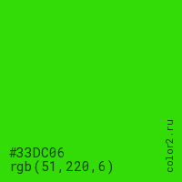 Цвет #33DC06 в цветовой модели RGB обозначается тремя октетами (51, 220, 6) в десятичном формате и #33DC06 в шестнадцатиричном (hex) формате, которые являются интенсивностью красного 51 (hex 33), интенсивность зелёного 220 (hex DC) и интенсивность синего 6 (hex 06).