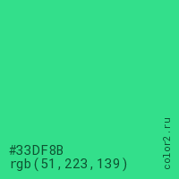 Цвет #33DF8B в цветовой модели RGB обозначается тремя октетами (51, 223, 139) в десятичном формате и #33DF8B в шестнадцатиричном (hex) формате, которые являются интенсивностью красного 51 (hex 33), интенсивность зелёного 223 (hex DF) и интенсивность синего 139 (hex 8B).