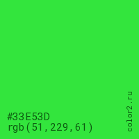 Цвет #33E53D в цветовой модели RGB обозначается тремя октетами (51, 229, 61) в десятичном формате и #33E53D в шестнадцатиричном (hex) формате, которые являются интенсивностью красного 51 (hex 33), интенсивность зелёного 229 (hex E5) и интенсивность синего 61 (hex 3D).